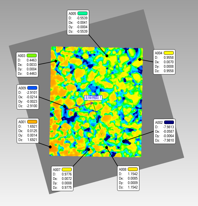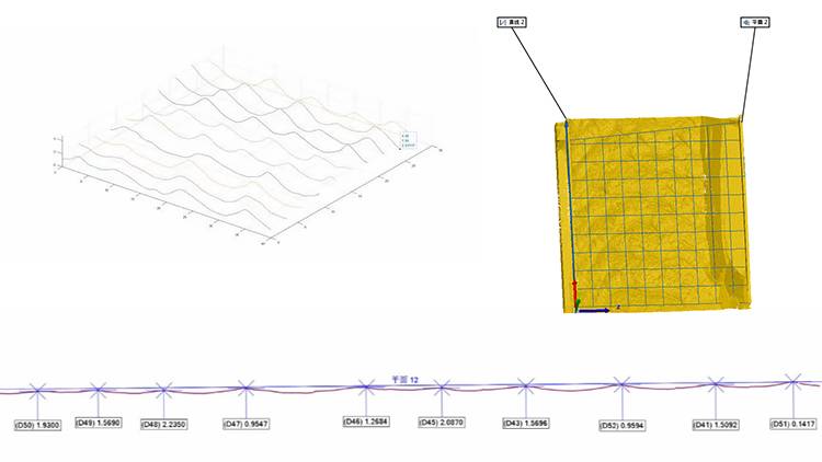 ◎扫描输出的三维模型直接导入到Geomagic Control检测软件中进行分析,图中是以一个水平面为参考,计算出的最大上偏差及最大下偏差,可以由此分析路面的形貌高差。