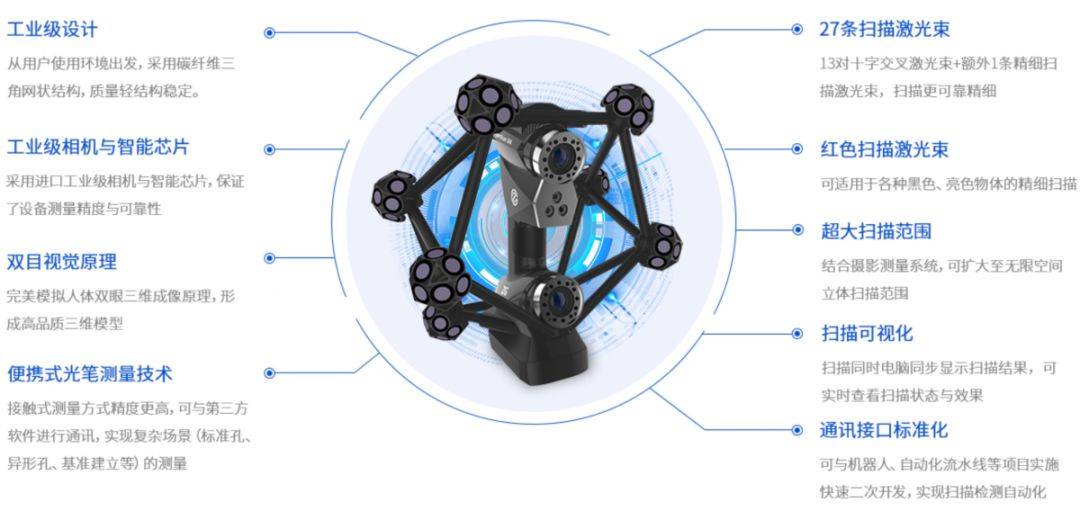 【适用领域】:质量检测与控制、逆向设计、数字展示、汽车制造、模具制造、航空航天、重工机械、医疗健康、3D打印、教 育科研、VR·AR等;