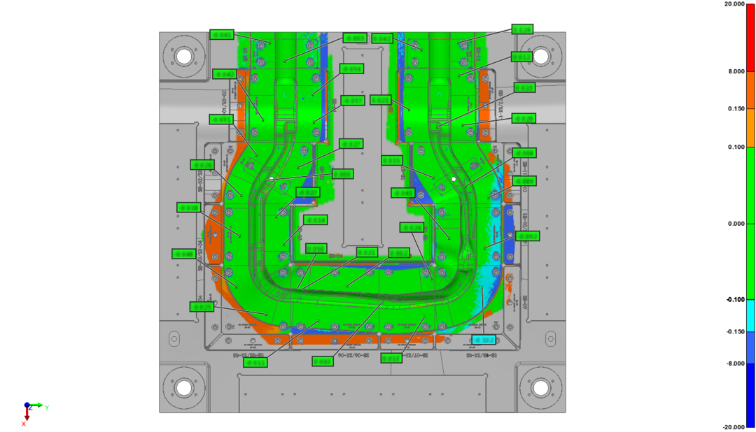 将扫描得到的三维数据与原数模进行比对分析,获取偏差尺寸,为质量检测及修模改模提供精确且直观的数据报告,大大提升模具生产效率和产品质量。