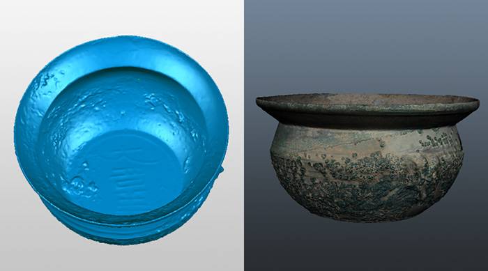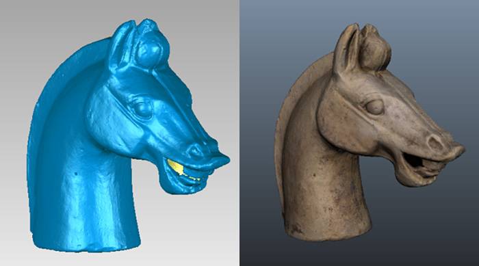 2、后期对文物外观拍照,通过ArtMapping软件将点云与影像自动配准融合,可以迅速得到单体文物带纹理模型,即可还原文物的真实外观。